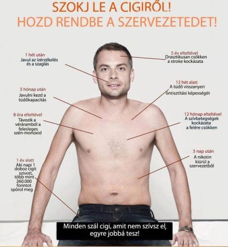 A cigaretta letételét követő 20 perc múlva a vérnyomás és pulzus visszatér a normális szintre, 8 óra múlva a vér oxigénszintje újra normális lesz, egy nap elteltével jelentősen csökken a hirtelen szívhalál kockázata, 3 hónap után a tüdő teljesítménye 30 százalékkal javul, 9 hónapot követően a krónikus köhögés megszűnik, egy év után a szívinfarktus, öt év után pedig a tüdőrák rizikója is a felére csökken. 10 év múlva a tüdőrák kockázata fele akkora, mint dohányzó embertársaink esetén. A heveny szívizom elhalás esélye megegyezik a soha nem dohányzókéval.